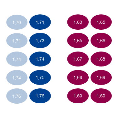 Richtig, bei der Berechnung des arithmetischen Mittels können wir jeden der gemessenen Jungen doppelt zählen. Wir gewichten sie also mit dem Faktor 2.