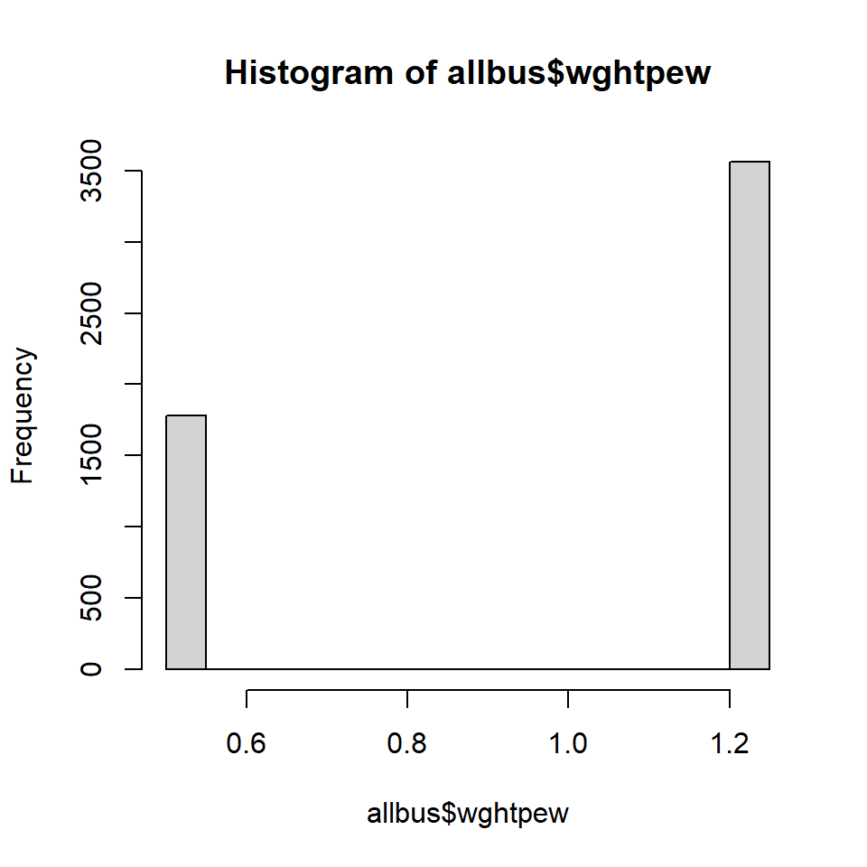 Aus der Dokumentation wissen wir also nun, welche Art von komplexen Stichprobendesign genutzt wurde und wie die Daten zu gewichten sind. Gehen wir jetzt in R und öffnen wir den Datensatz und sehen uns die entsprechenden Gewichtungsvariablen einmal an. Wir laden den Allbus.