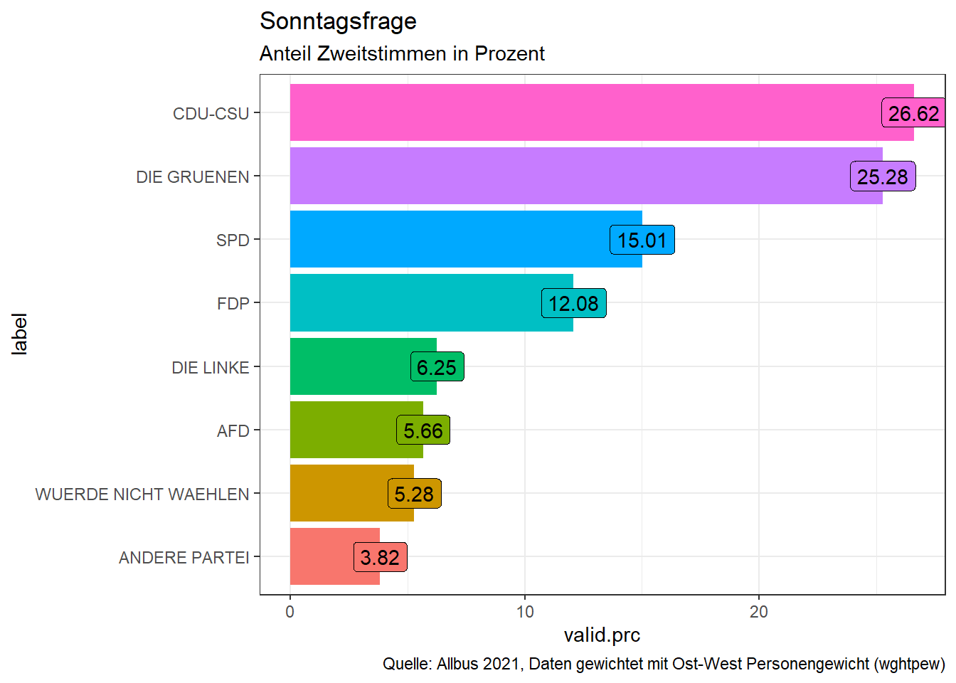 Es liegen die folgenden Merkmalsausprägungen vor:Wenn am nächsten Sonntag Bundestagswahl wäre, welche Partei würden Sie dann mit Ihrer ZWEITSTIMME wählen?