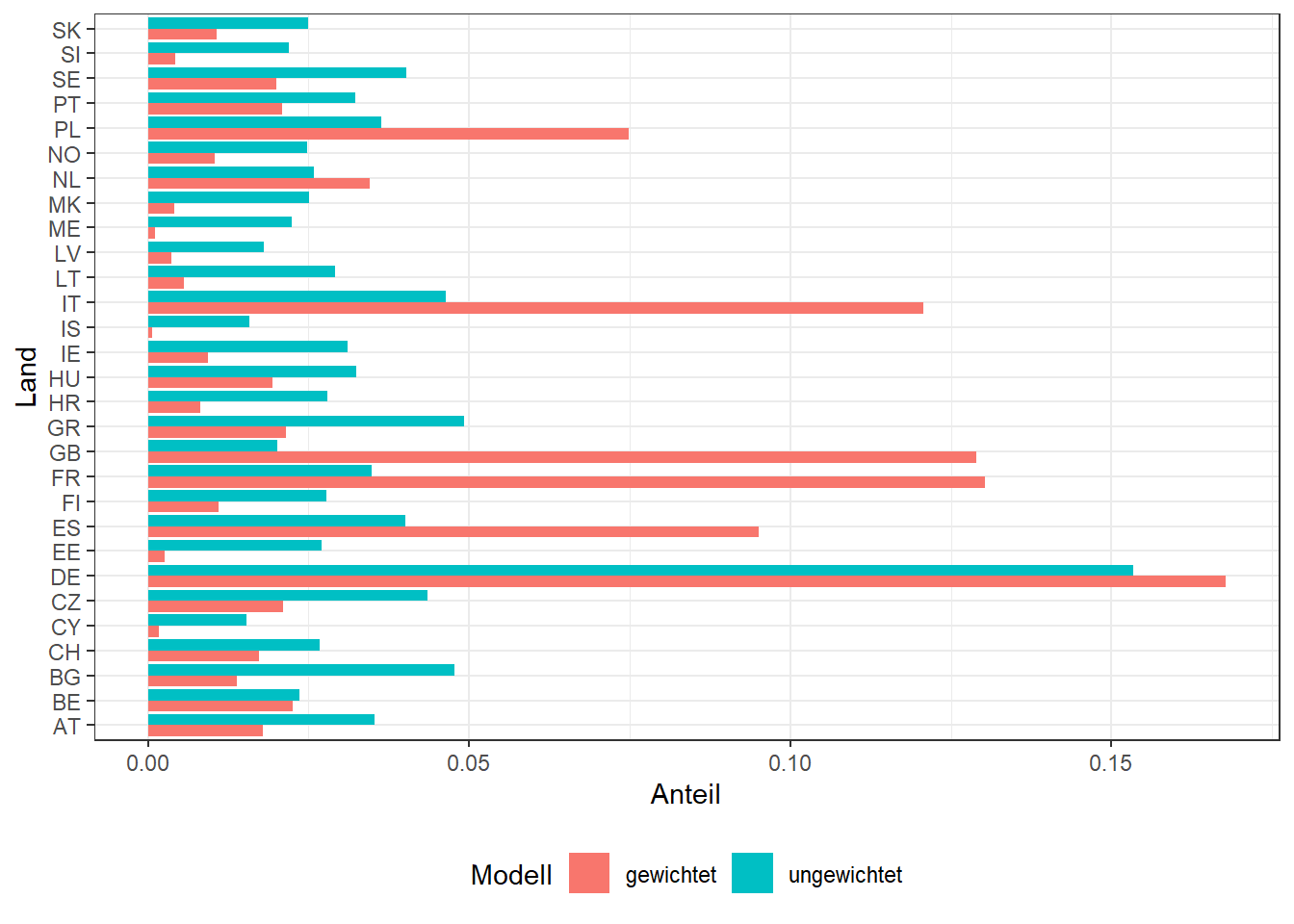 Befragte bevölkerungsstarker Länder werden also hochgewichtet, Befragte kleinerer Länder bekommen ein kleineres Gewicht, damit im Aggregat, das Verhältnis der Anzahl Befragten unabhängig von der jewiligen Stichprobengröße zu den Bevölkerungsgrößenverhältnissen der Länder zueinander passt.