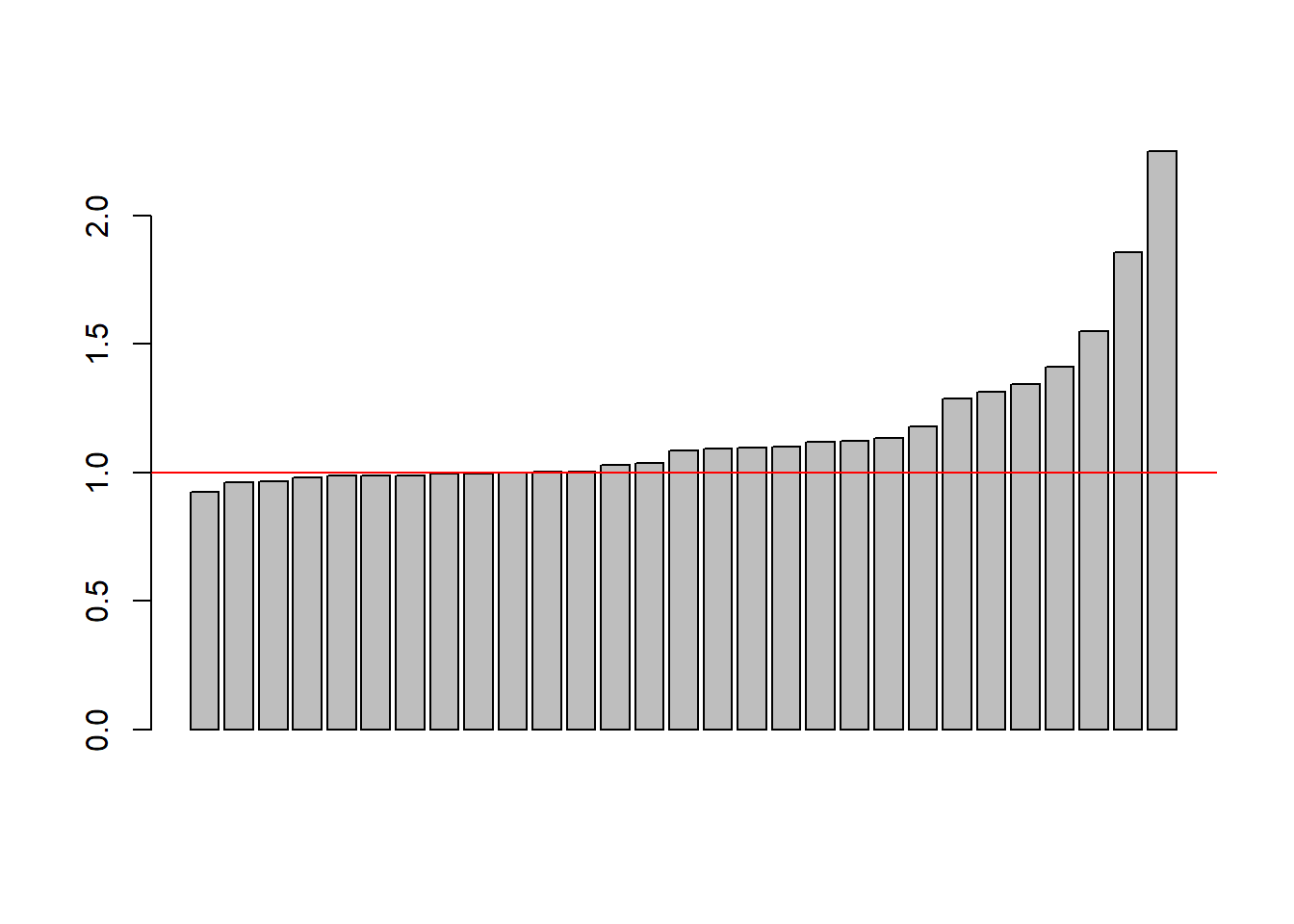 barplot(sort(mw2$se/mw1$se))