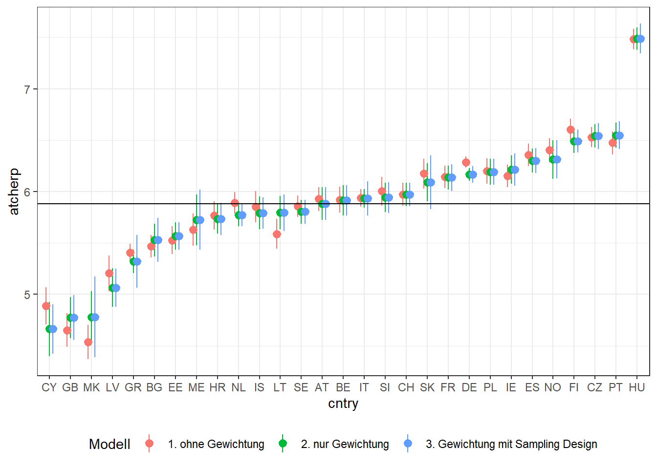 df$cntry <- forcats::fct_reorder(df$cntry, df$atcherp)Jetzt kann ich die Vergleichsgrafik mit ggplot() erstellen: